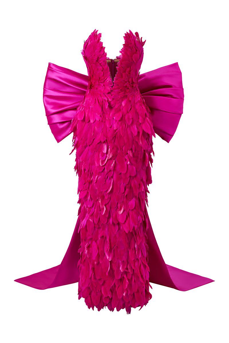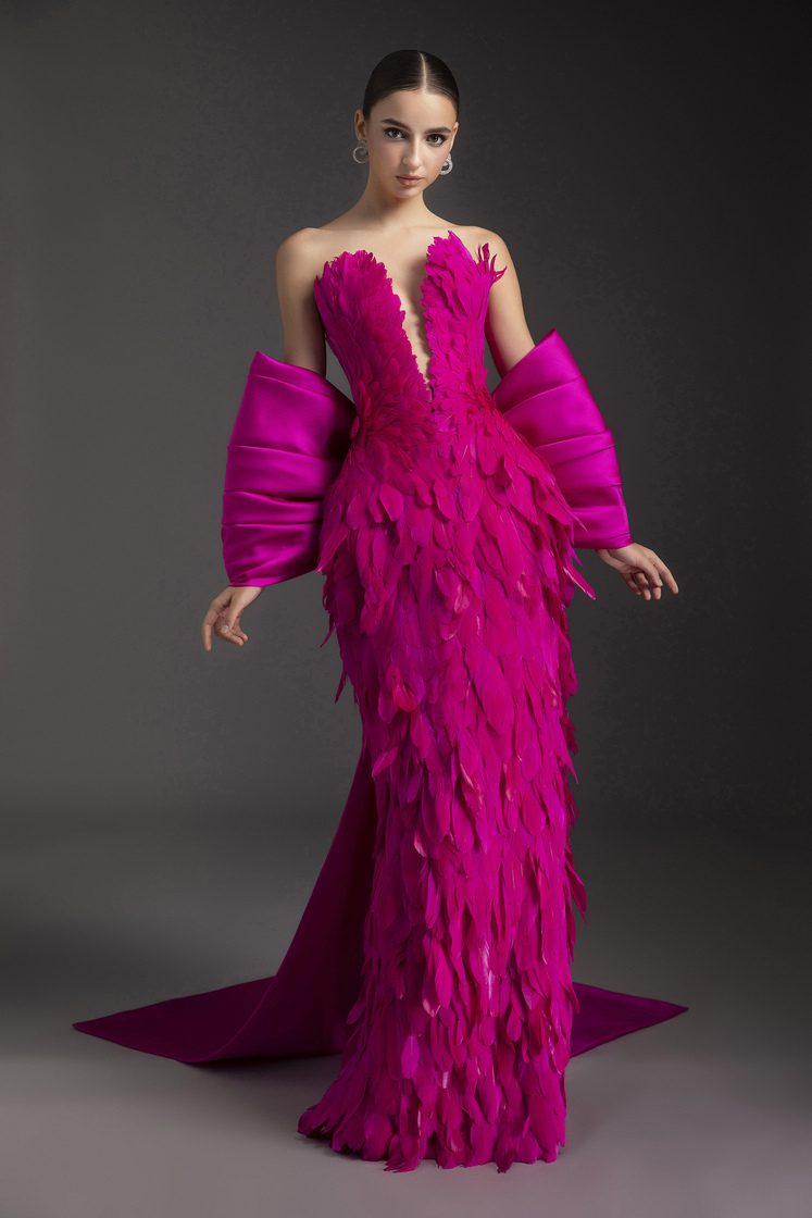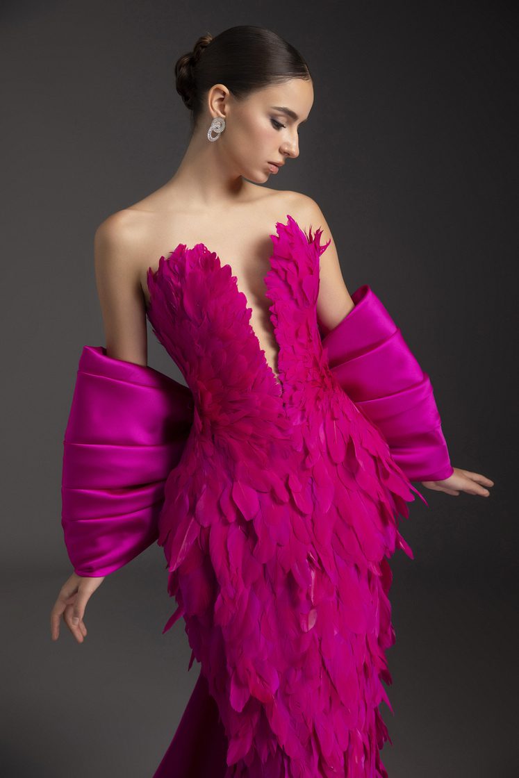 Discover our exquisite collection of feather-trimmed garments, perfect for adding a touch of glamour to your wardrobe.