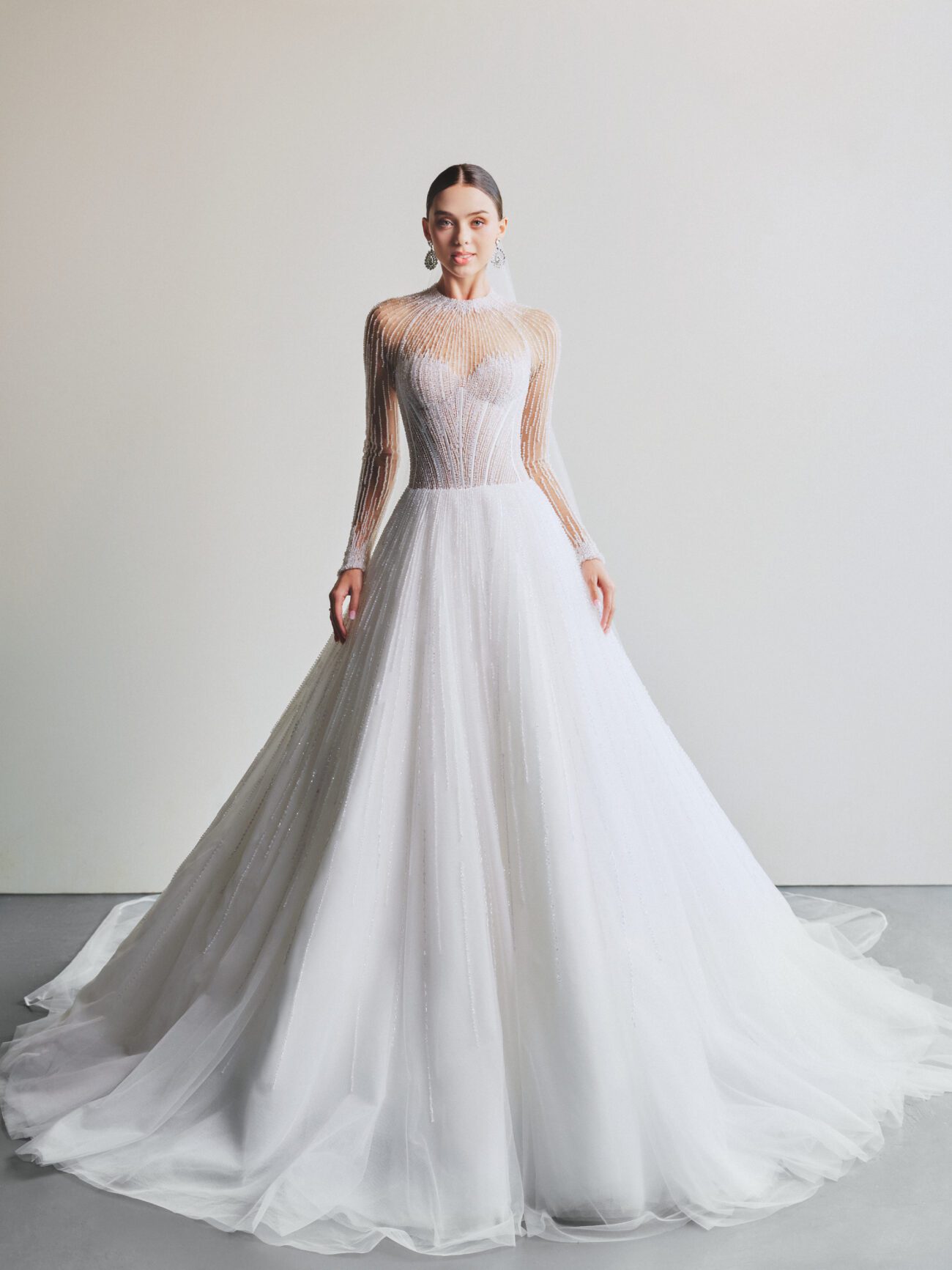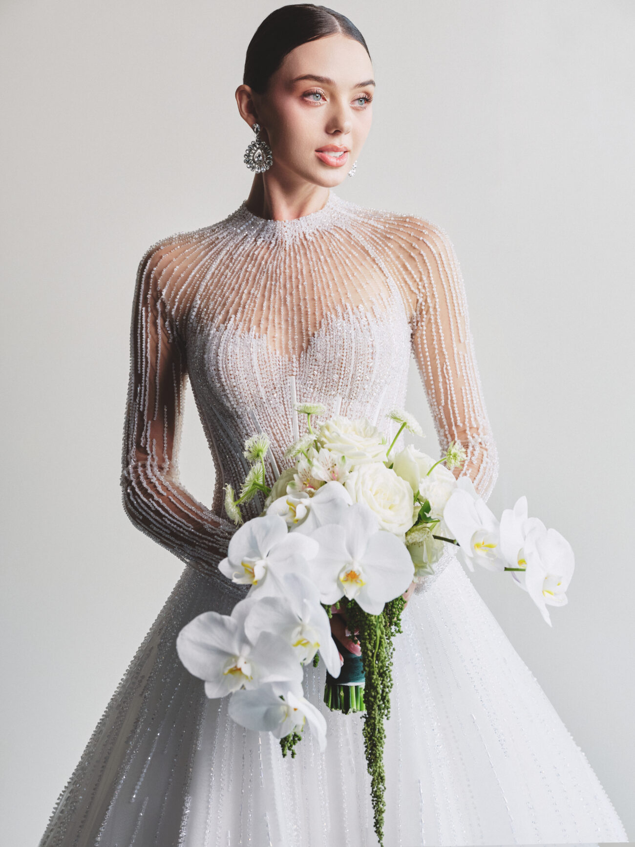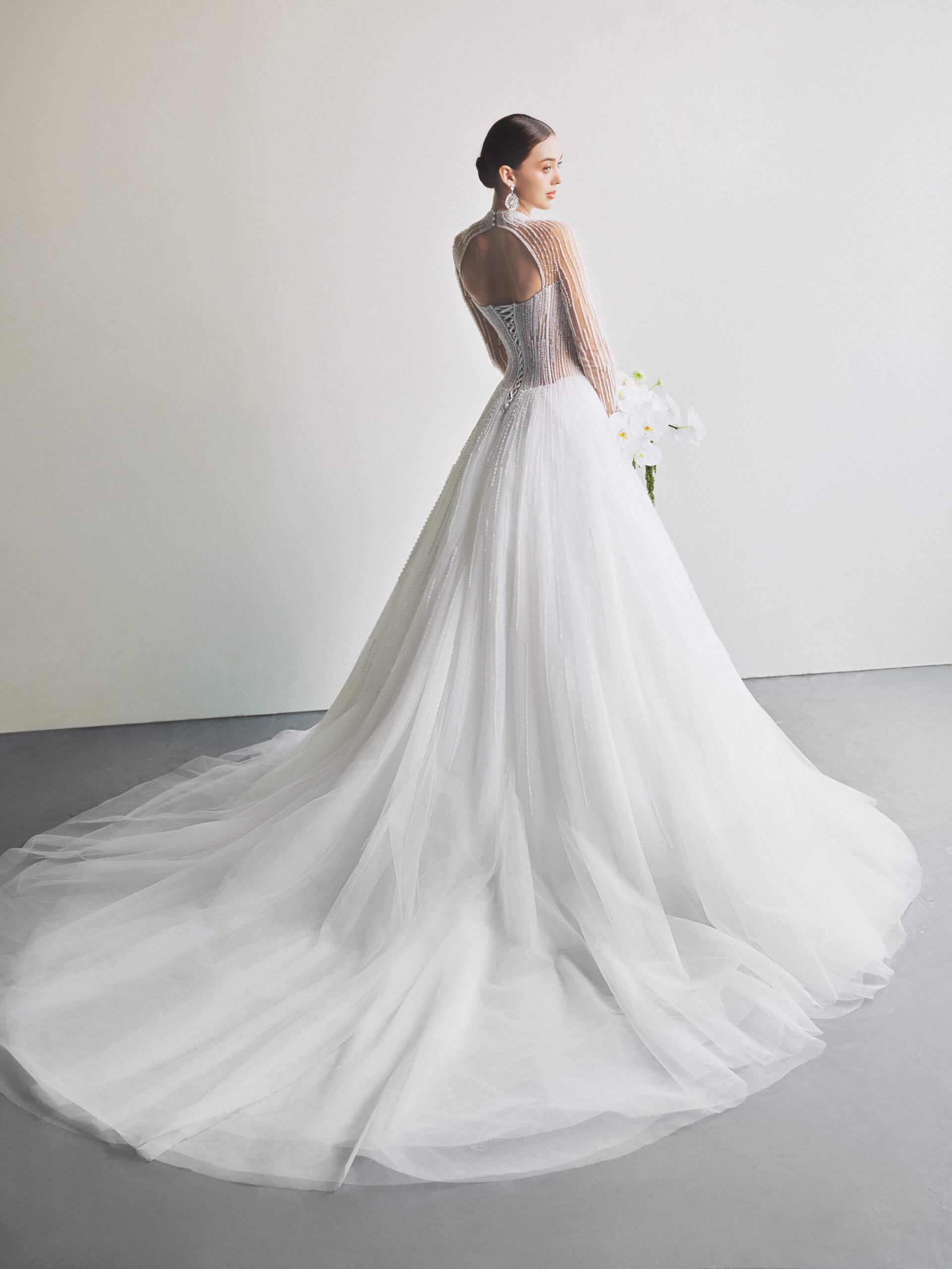 This design features an elegant A-line silhouette with a defined waistline that beautifully accentuates the narrowest part of the female form. Against a backdrop of premium soft tulle, the brand’s leading artisans devoted hundreds of hours to meticulously hand-embellishing the entire surface with sparkling crystal stones. This painstaking detail evokes the enchanting imagery of dew-kissed fabric shimmering under the first rays of morning sunlight.