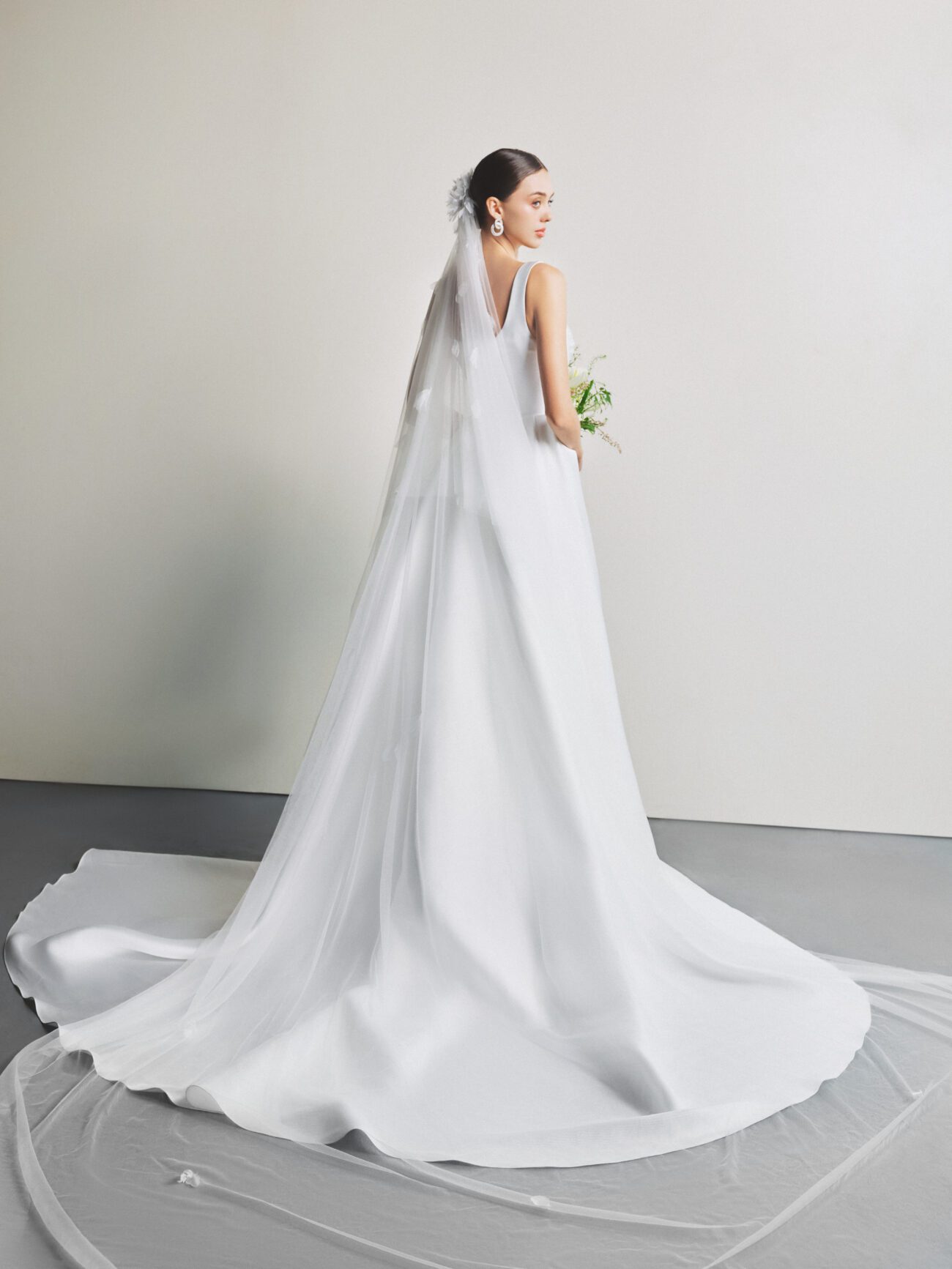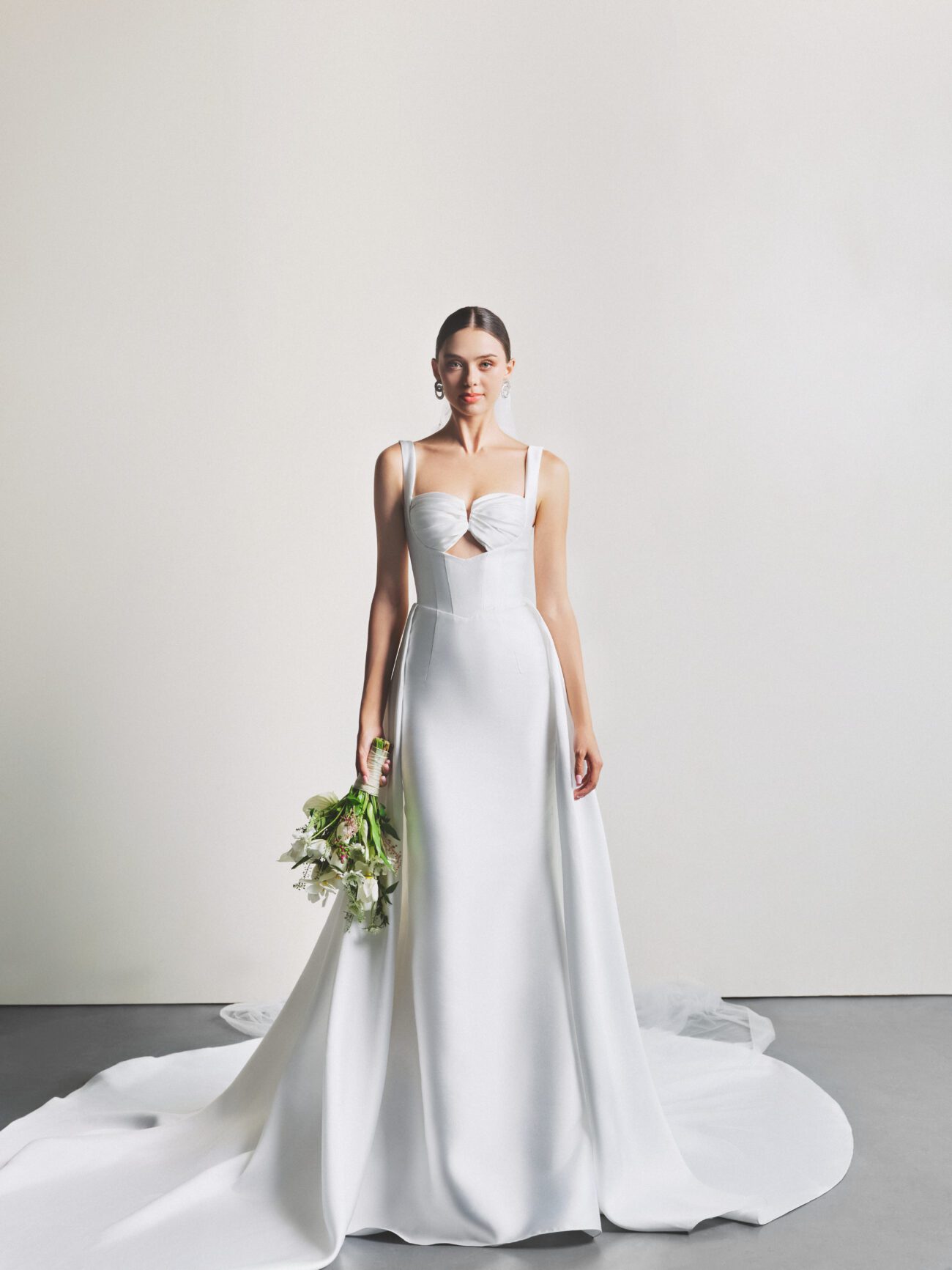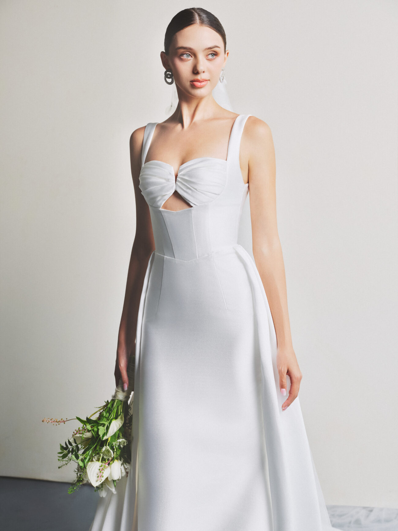 The gown is adorned with a captivating cut-out section featuring striking pleat detailing. This specific technique demanded meticulous calculation from the design team to achieve optimal aesthetic appeal and visual impact. Further enhancing the design is a lightweight overskirt, which drapes softly to create graceful movement and effortlessly draw every eye.