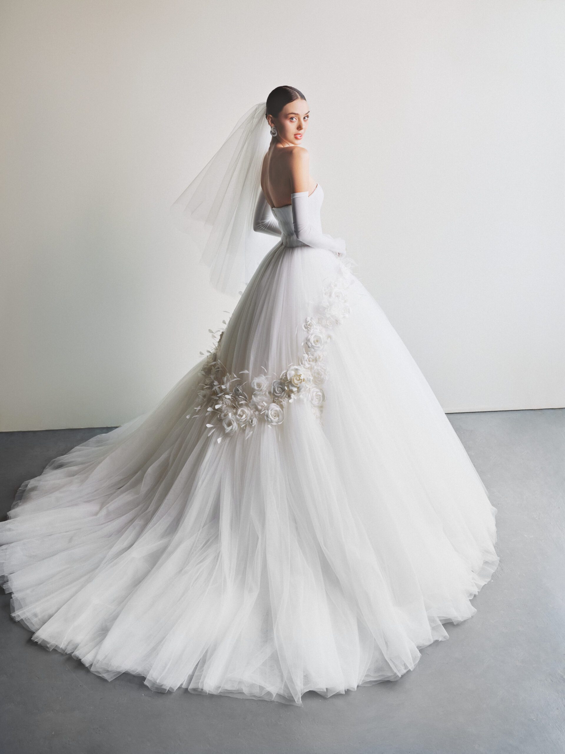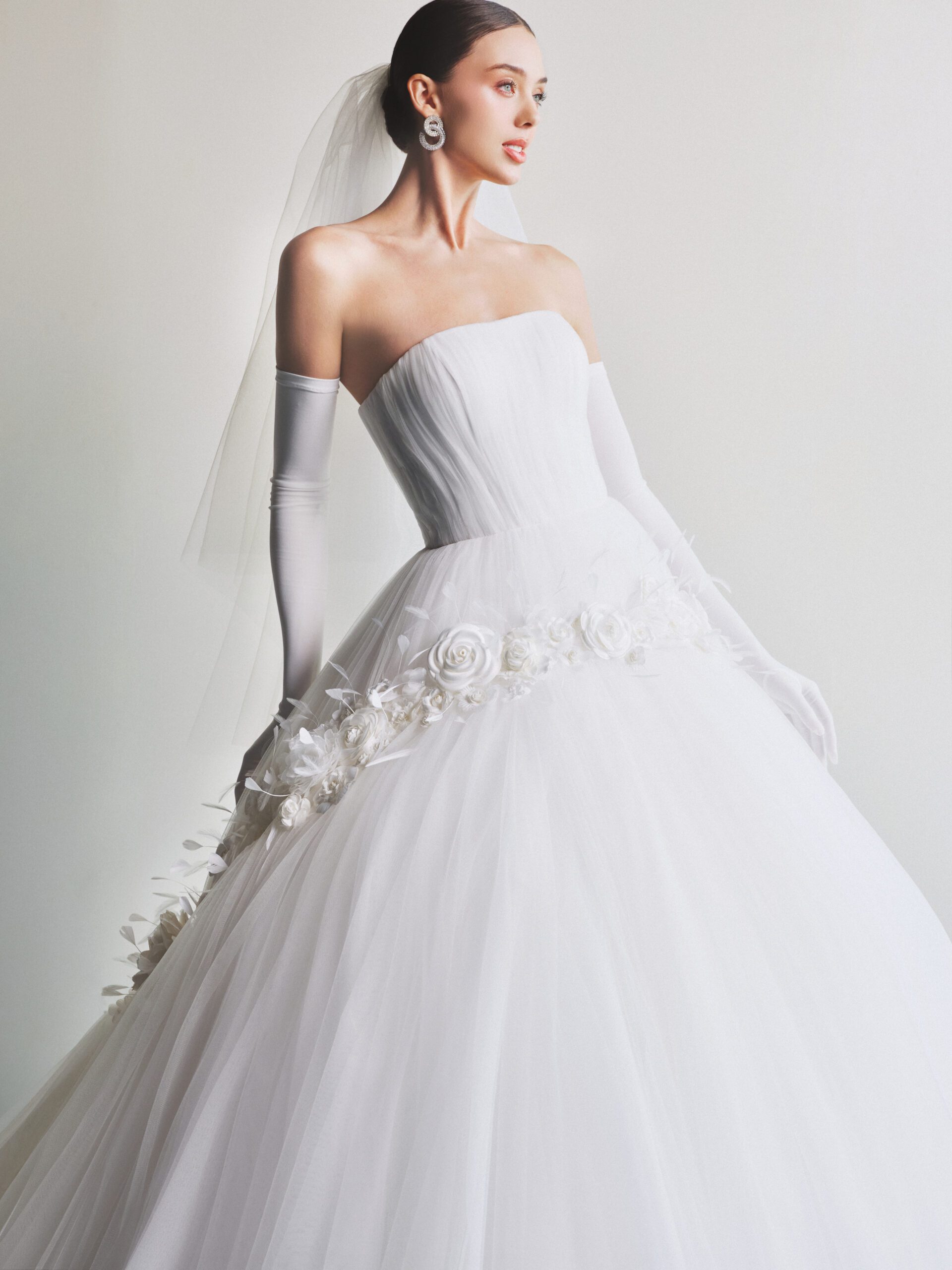 This design is inspired by the weightless flutter of petals, creating an ethereal and romantic visual tableau. It features a magnificent Ballgown silhouette, achieved by combining hundreds of meticulously cut tulle layers to produce a stunning, voluminous effect. The structure is defined by an elegant sweetheart neckline that gracefully highlights the shoulders. The skirt is the focal point, brought to life by exquisite 3D floral appliqués, all meticulously crafted by the master artisans at LE THANH HOA Bridal.