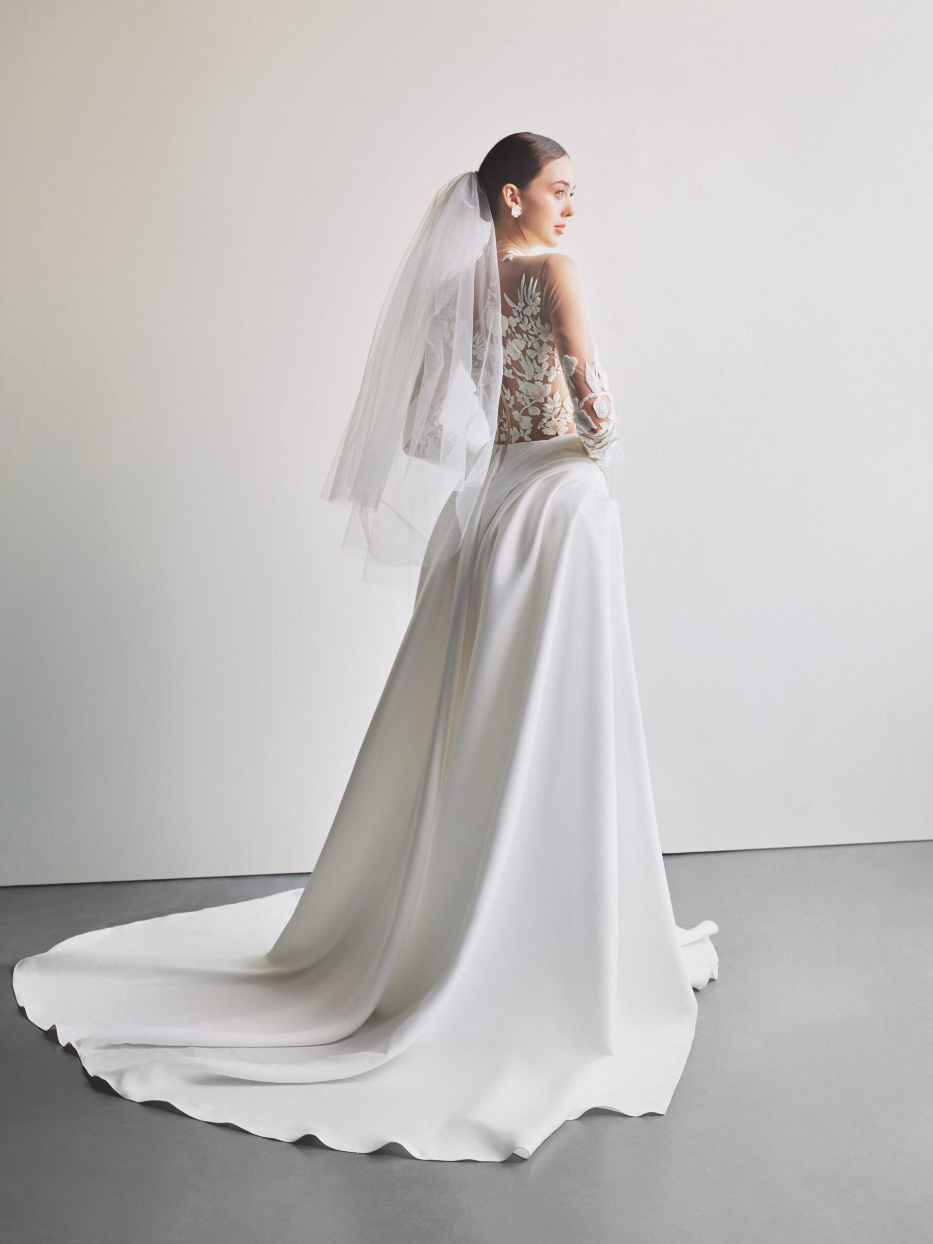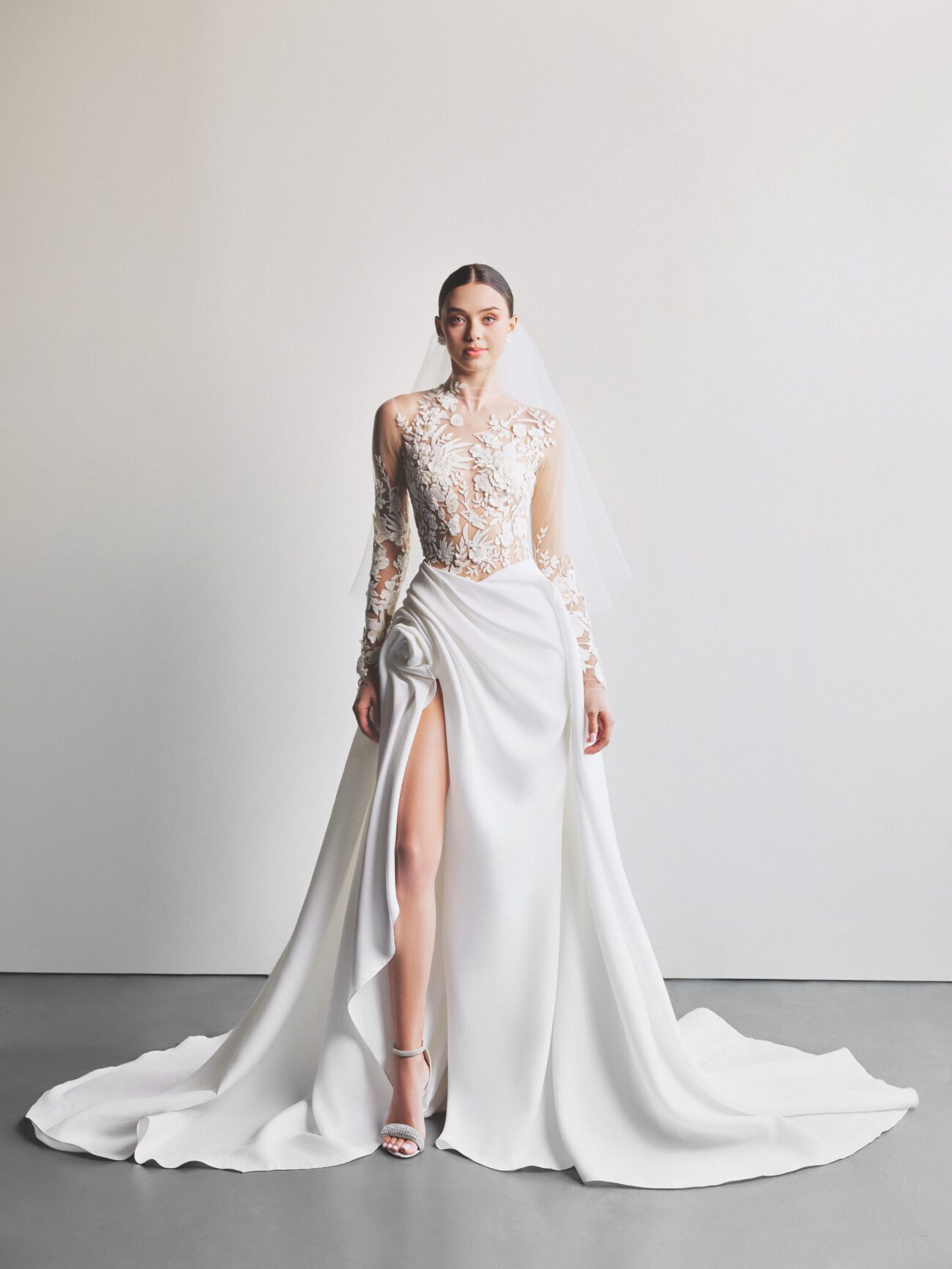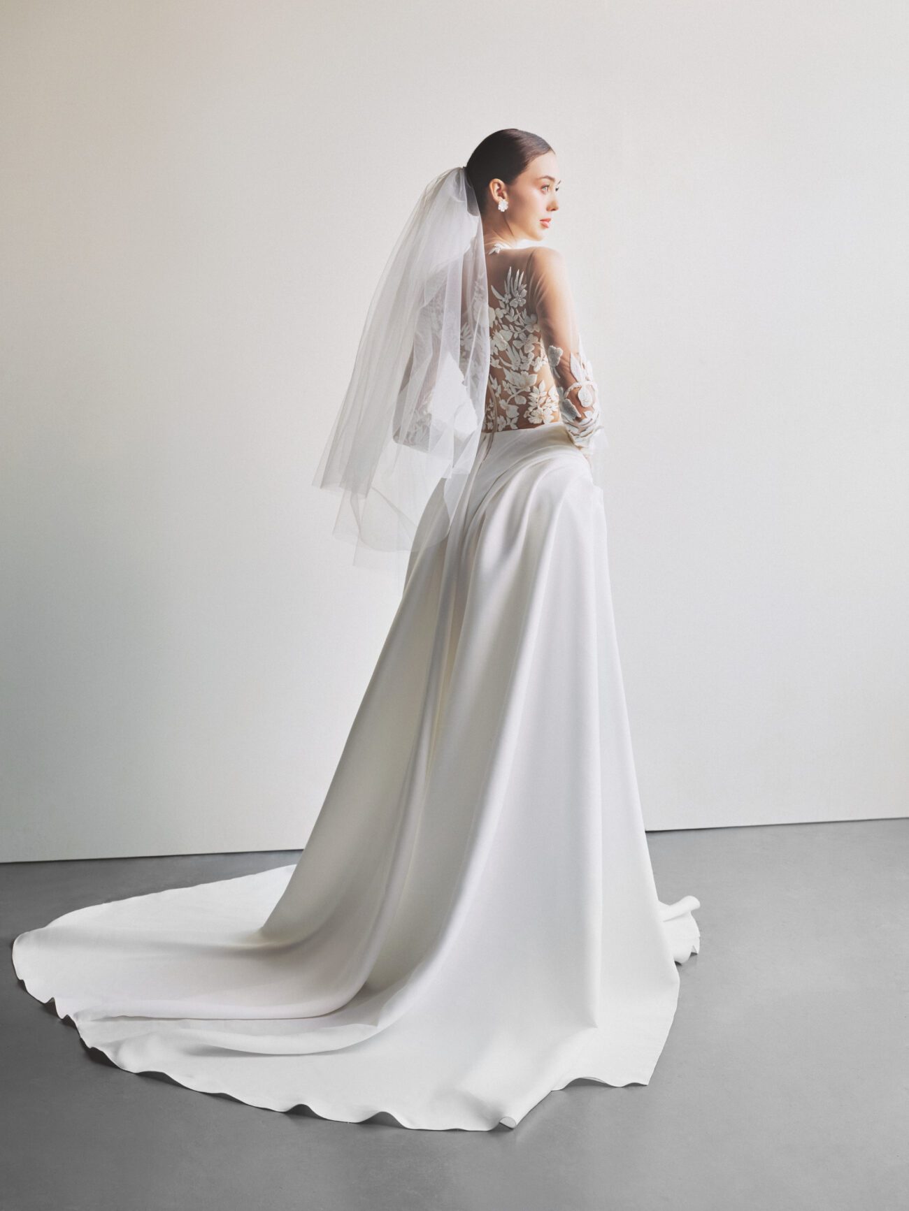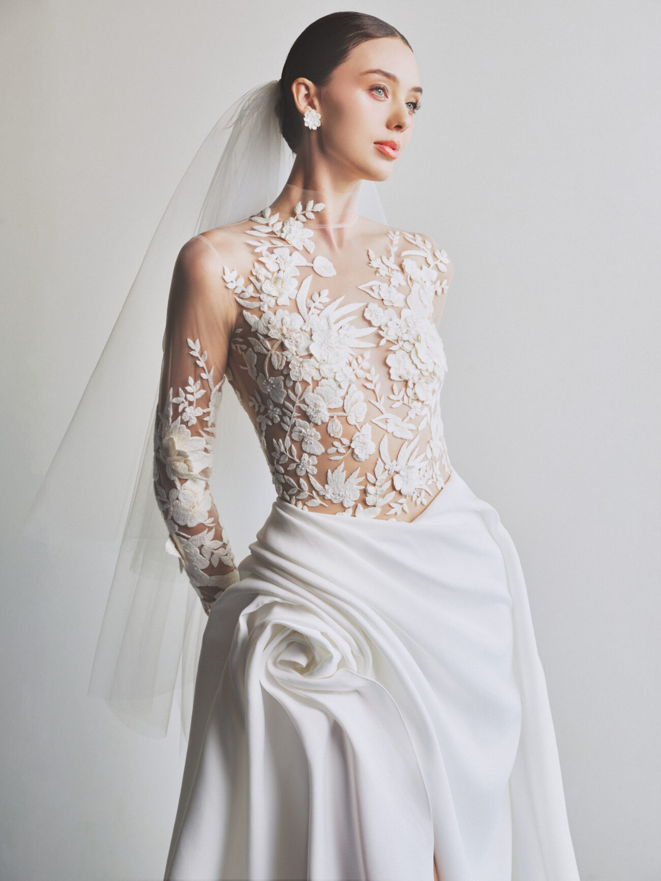 Infused with classic beauty, this design features a skirt crafted from premium mikado fabric, contrasted with sheer tulle for the bodice. The floral details are painstakingly handled, utilizing the meticulous hand-embroidery techniques of LE THANH HOA Bridal’s leading artisans. A striking highlight of this gown is the slit skirt, elegantly stylized with a handcrafted 3D rose bloom. This detail perfectly accentuates the bride’s gentle elegance and poised sophistication.