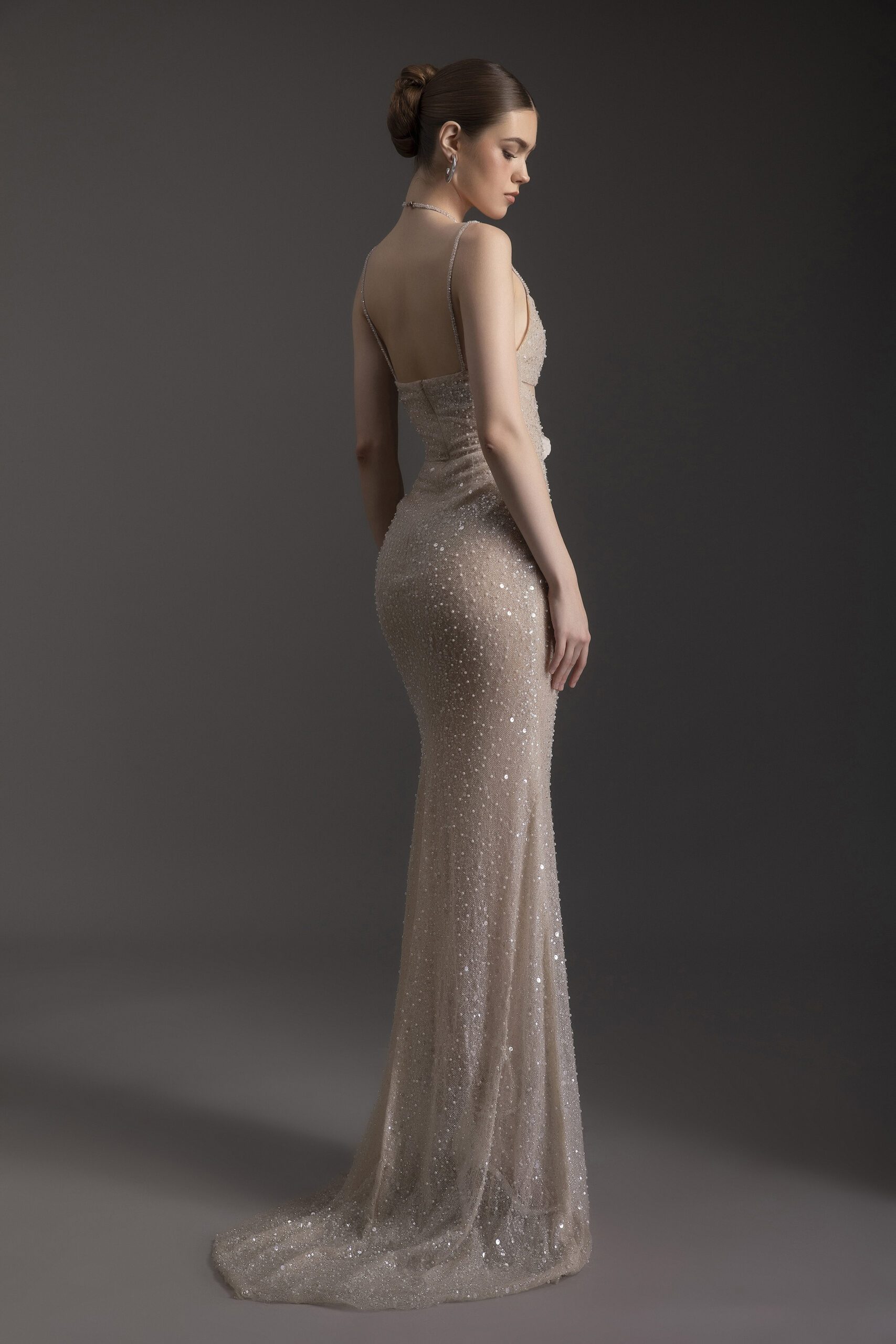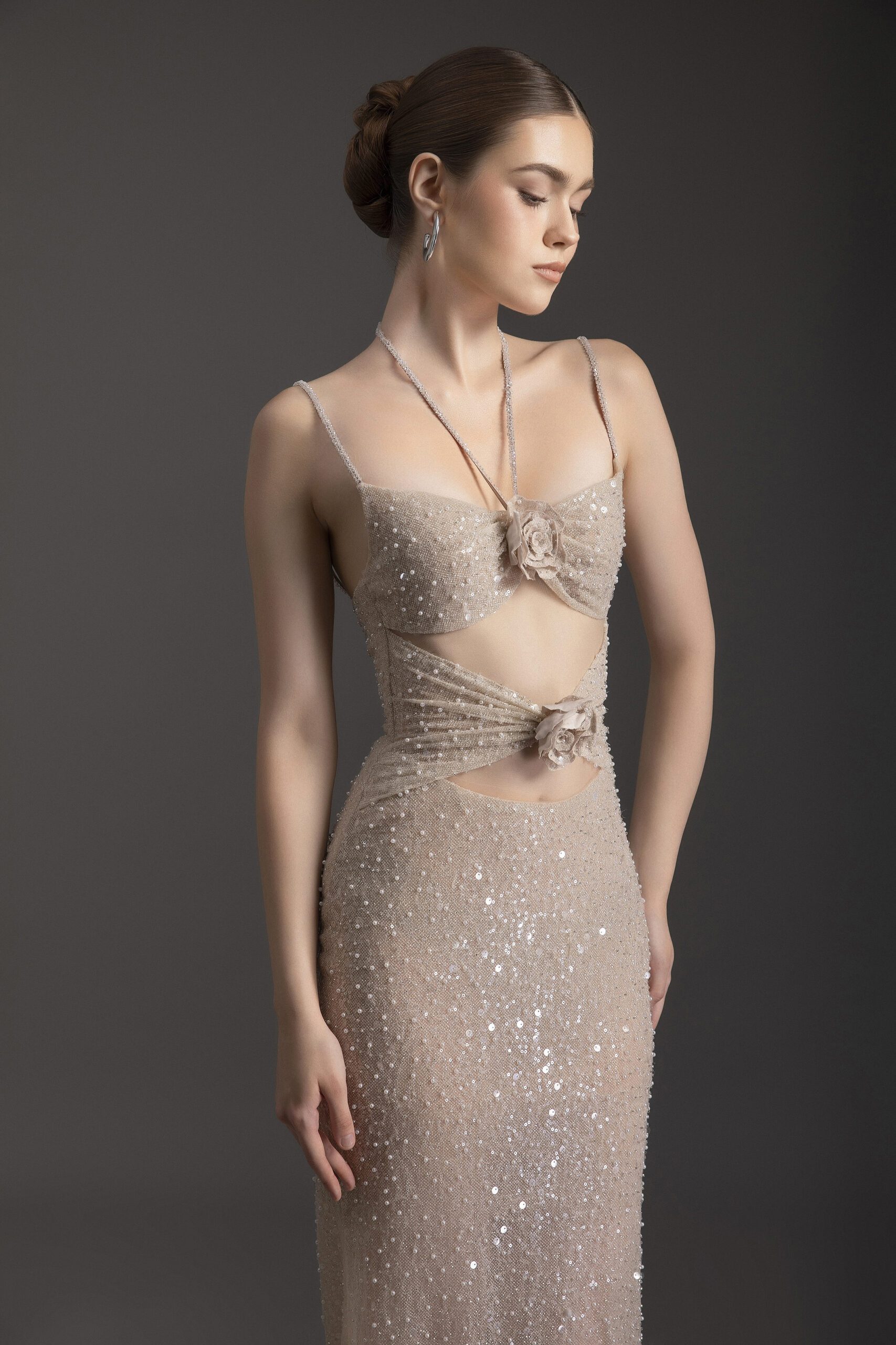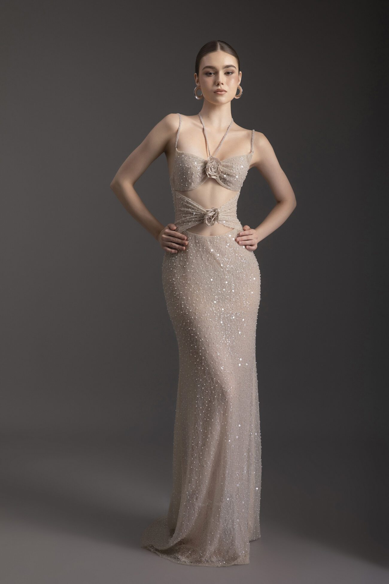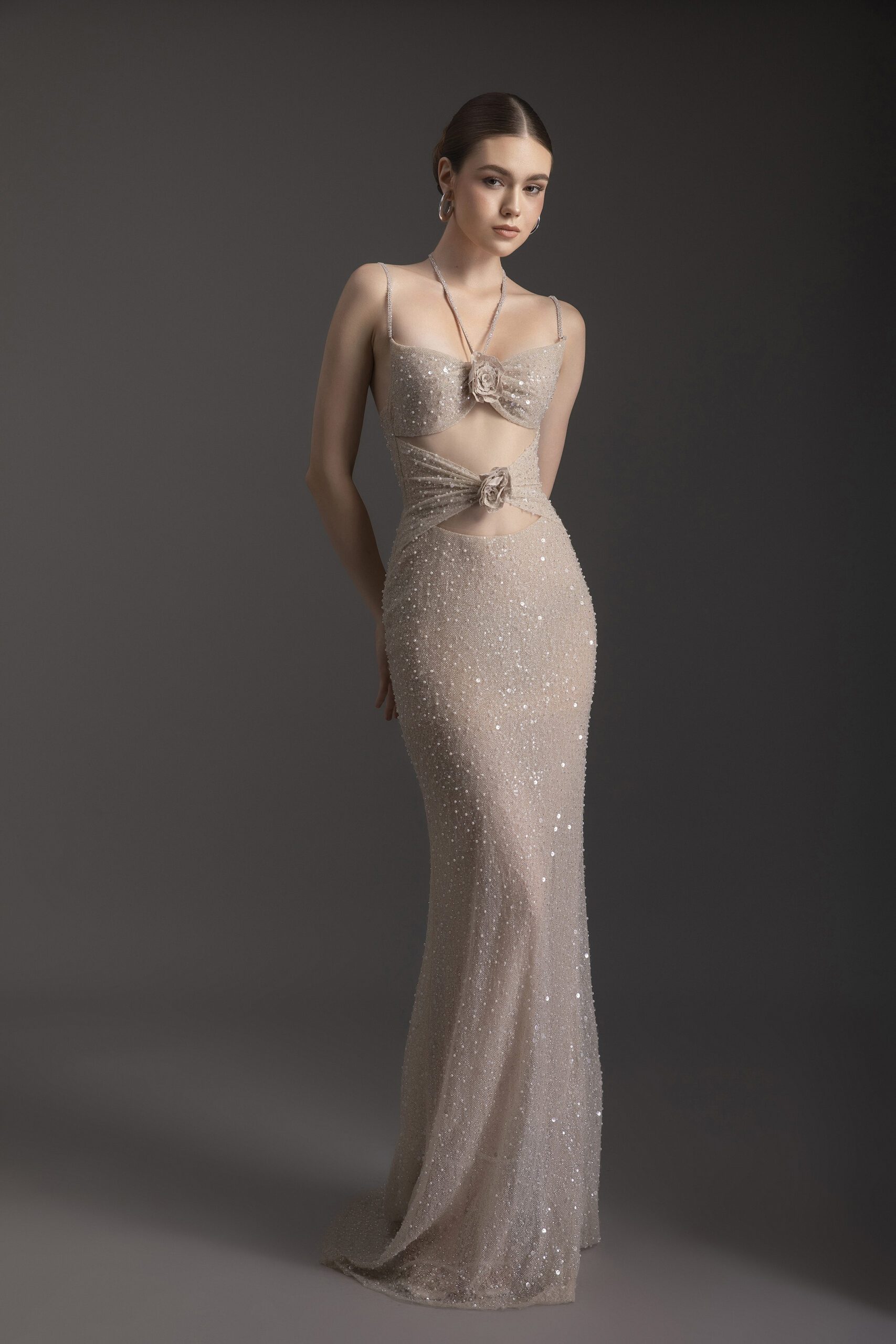 A dazzling nude-toned sequin gown with a form-fitting silhouette. The design features a delicate knot detail at the bust and a stylish midriff cutout, creating a modern and alluring look. The entire dress sparkles with intricate, head-to-toe embellishment.