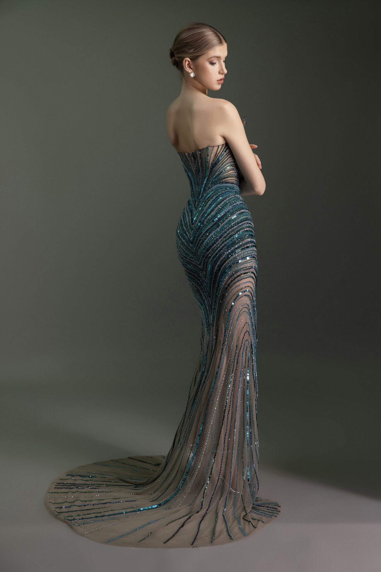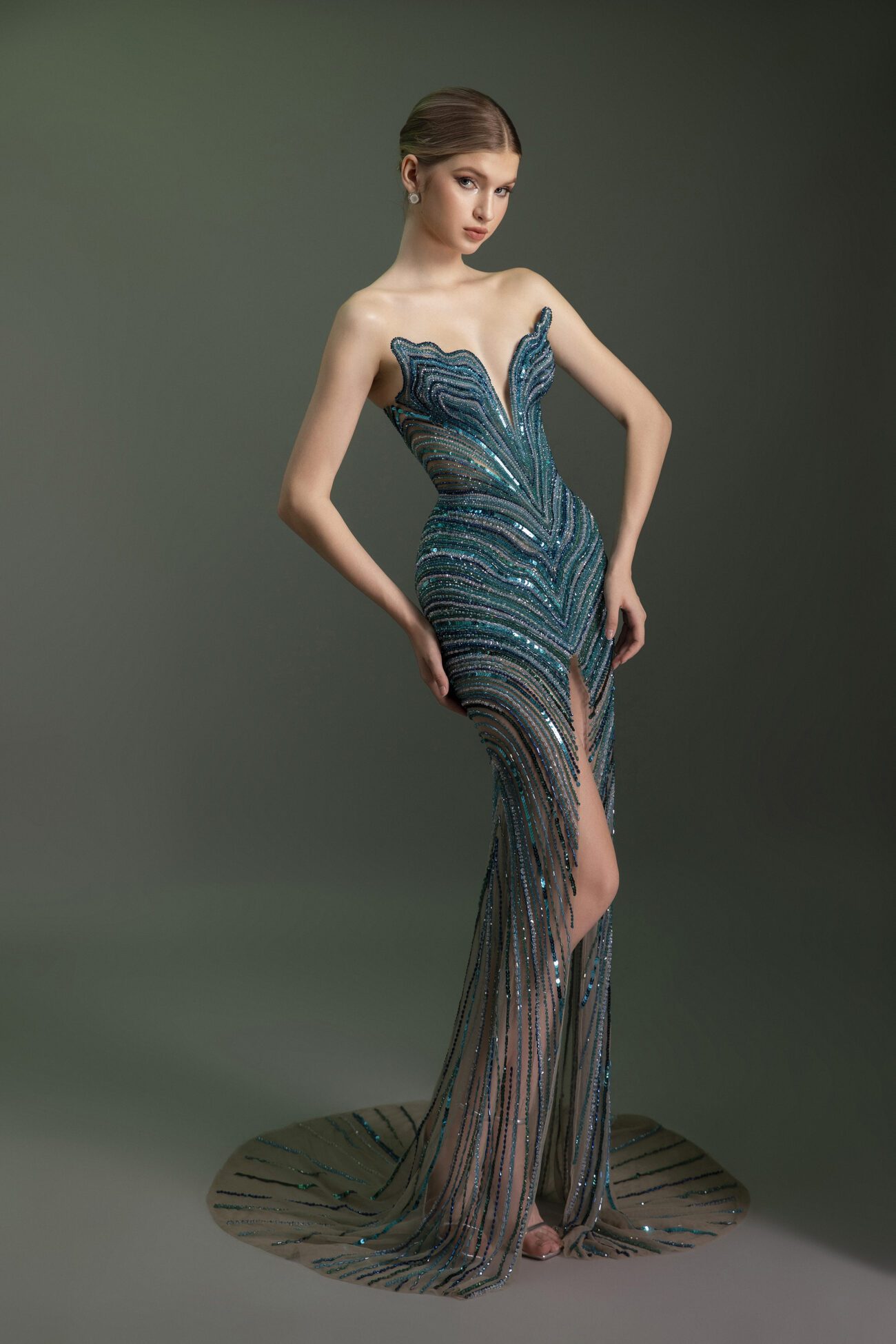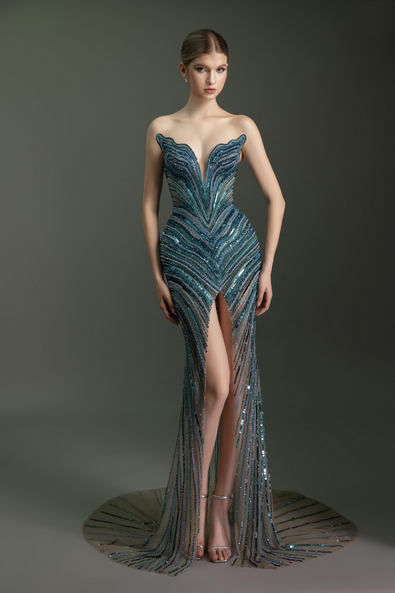 A breathtaking sequined teal gown with a form-fitting silhouette and a deep plunge neckline. The dress is meticulously adorned with sparkling beads and sequins in a radiating, chevron-like pattern that creates a mesmerizing visual effect. The beading extends to the floor, forming a delicate fringe that adds a touch of ethereal magic.
